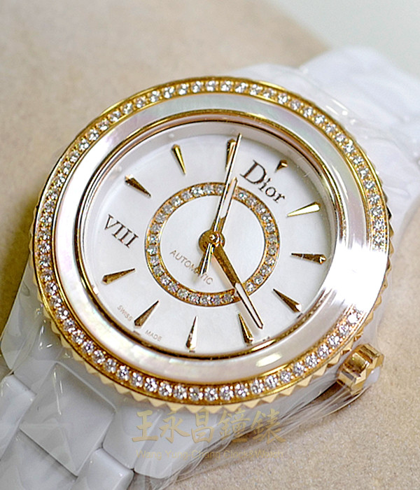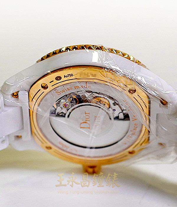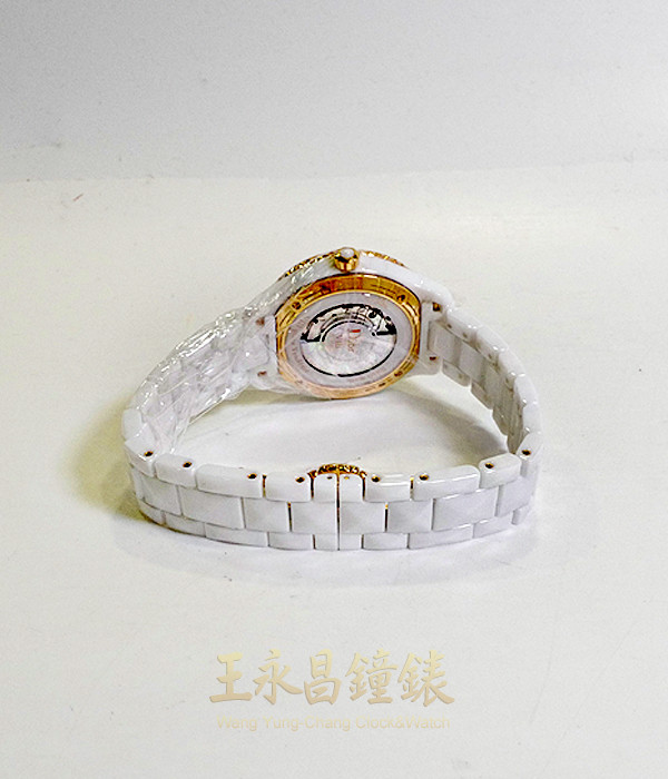 具時.分.秒針顯示、錶面及外圈上皆有原鑲鑽石、18K及白色貝母錶圈、弧型藍寶石水晶玻璃、透明錶背