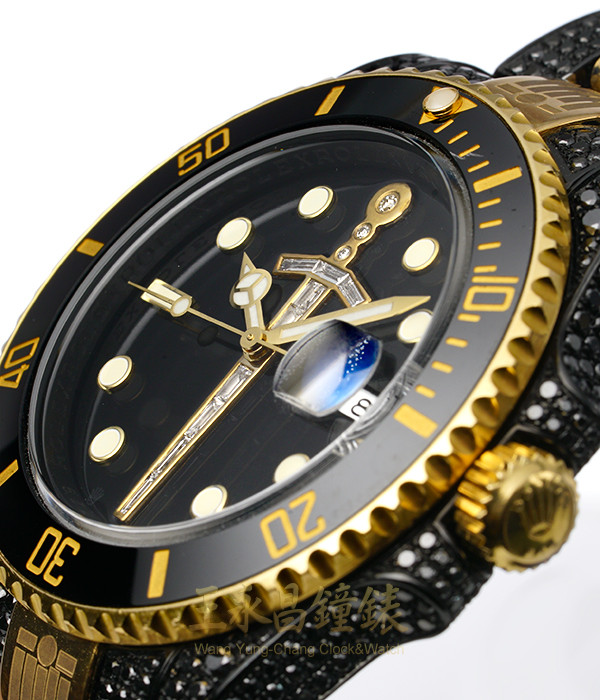 面盤上有後加的鑲鑽寶石劍,錶鏈上有身體的裝備圖樣,錶殼及錶鏈鑲滿黑色寶石