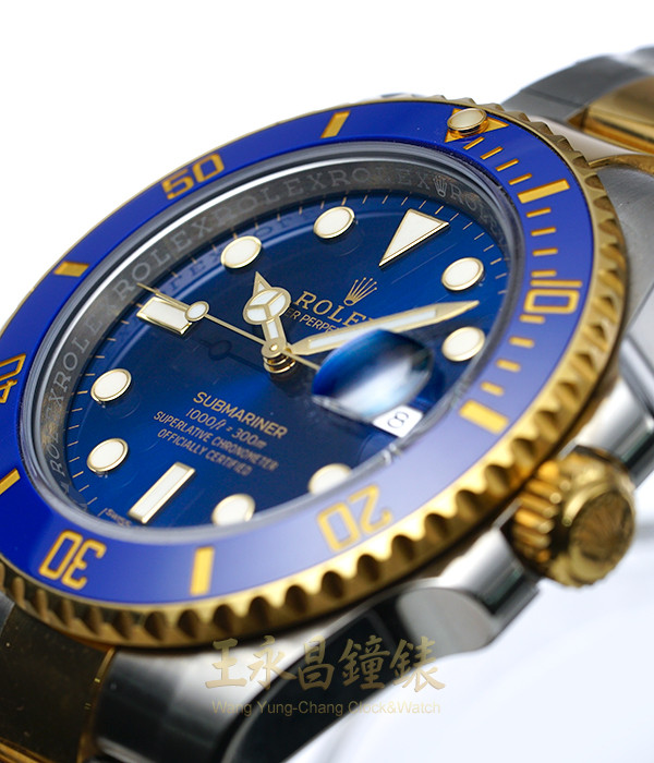 具時.分.秒針及日期顯示、藍色陶瓷合金單向旋轉簡易計時外圈、旋入式錶冠及底蓋、藍寶石水晶玻璃、內圈刻有一圈防偽ROLEX字樣及流水號、亂碼字頭
