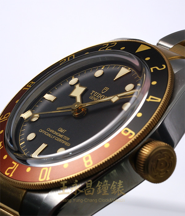 具時.分.秒針及日期顯示、黑棕雙色陶瓷環可雙向旋轉外圈、旋入式錶冠及底蓋、弧型藍寶石水晶玻璃