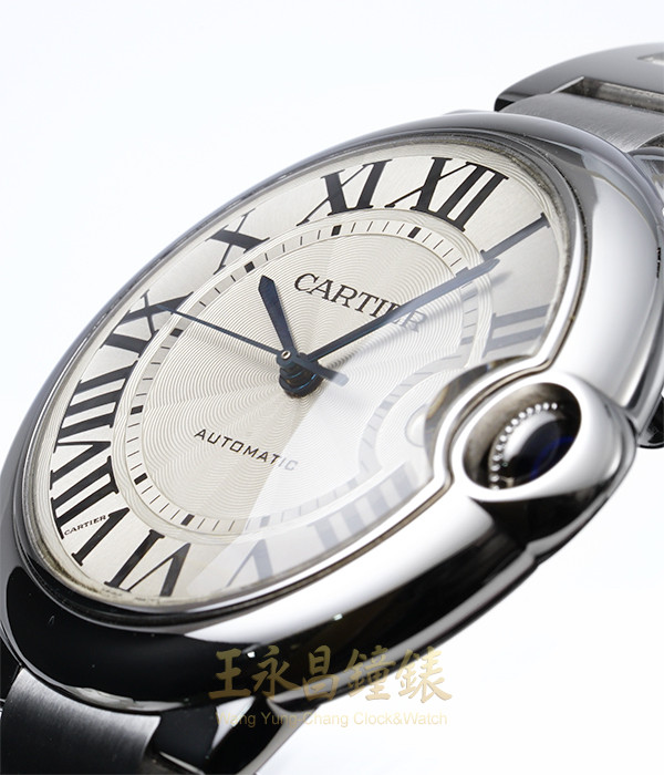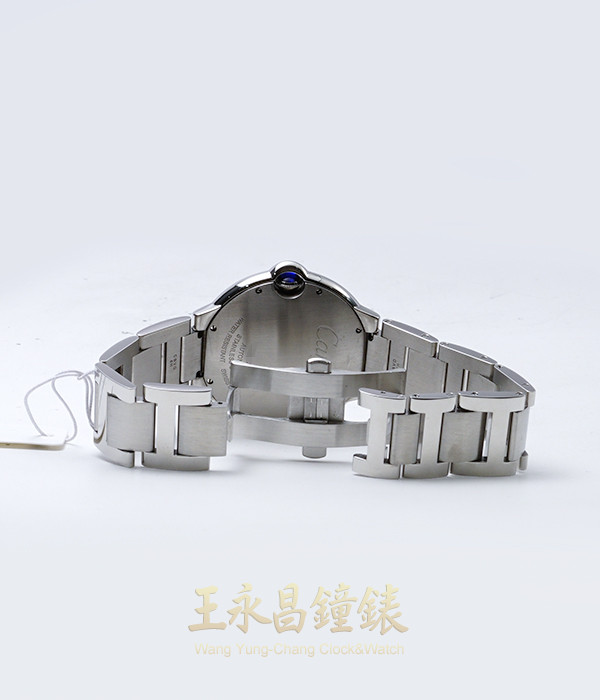 具時.分.秒針顯示、錶冠鑲有一顆藍色合成寶石、弧形藍寶石水晶玻璃