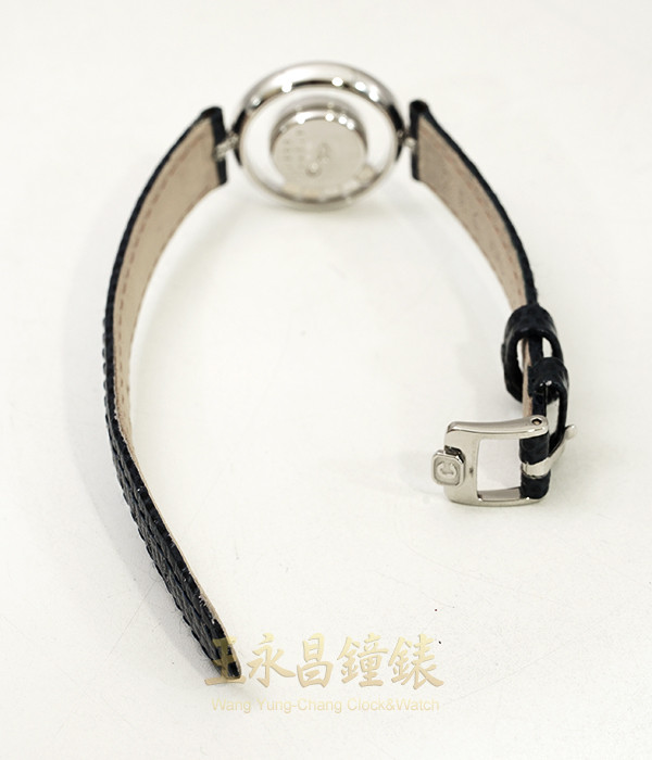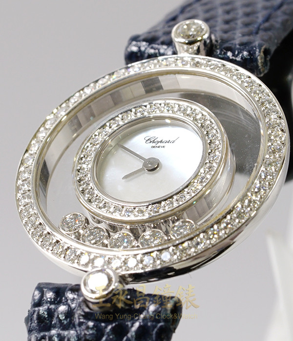 具時.分針顯示、原鑲鑽圈及錶耳、內有五顆快樂鑽、藍寶石水晶玻璃
