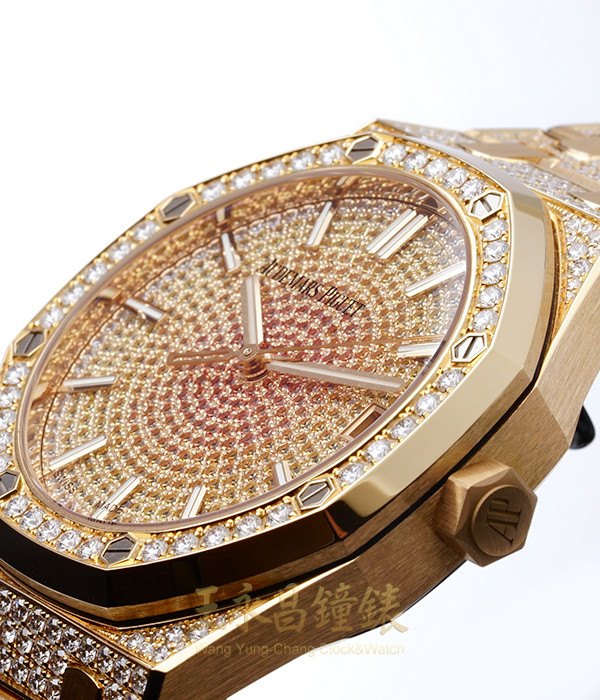 其錶殼和錶帶鑲嵌610顆明亮式切割美鑽,錶面則鋪鑲466顆漸層色調橙色藍寶石。
