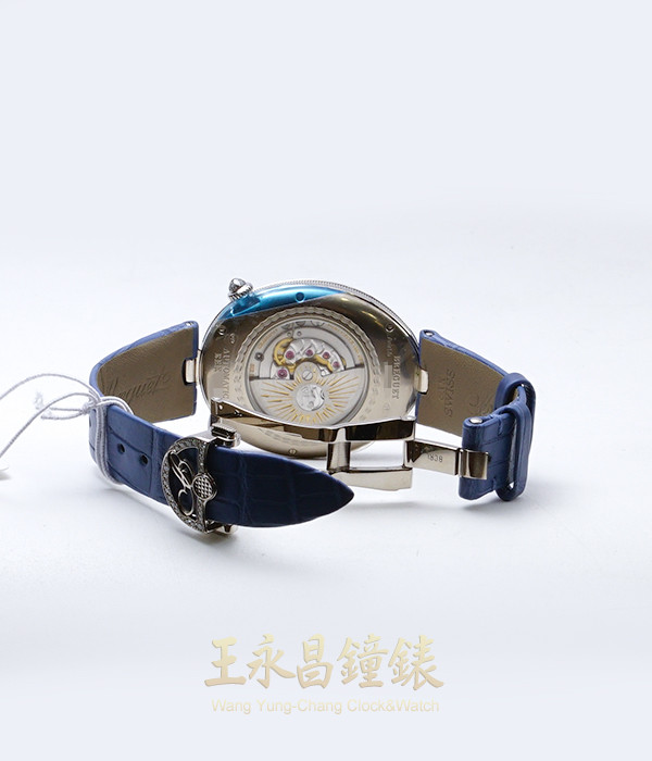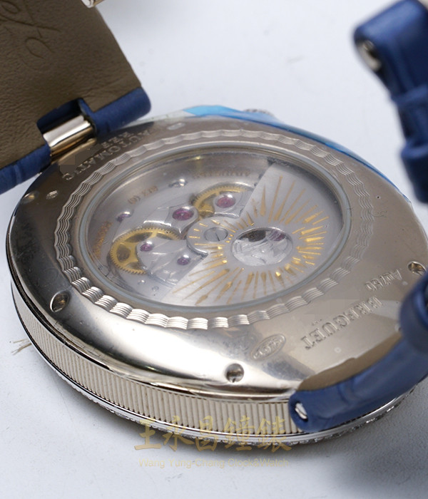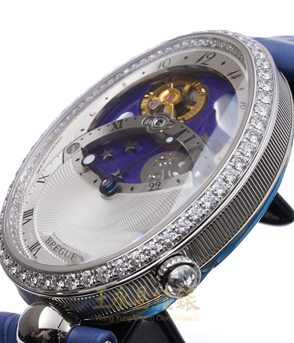 腕錶搭載的專利機芯由兩枚錶盤組成,一枚以傳統方式顯示時和分,另一枚則配備晝/夜顯示複雜功能。青金石圓盤代表著天空,其上鑲嵌天然白色珍珠母貝雲彩、金質星星和手工雕刻鈦金屬月亮。刻面擺輪上的斜紋令人想起真正的主角——光芒四射的太陽。擺輪每天旋轉一圈,從支撐機械裝置的精鋼錶橋下穿過,始終與月亮兩相對望。