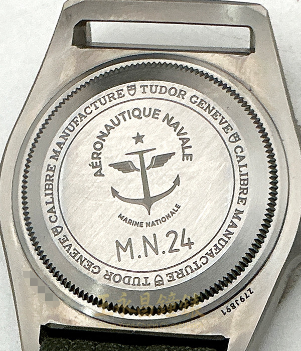 帝舵與法國海軍(Marine Nationale)數十年合作關係的軍規認證。 底蓋正中央雕刻的是 法國海軍航空兵(Aéronautique Navale) 的Logo。 錨:象徵海軍傳統。 飛翼:代表這支錶是專為「飛行員」設計的工具。\ M.N.24:代表 Marine Nationale(法國海軍)生產年份為 2024 年。 當時軍方發放的錶底蓋都會刻上 M.N. 加年份。