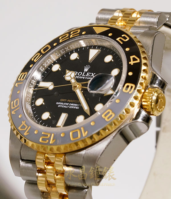 具時.分.秒針.日期及兩地時間顯示、雙向可旋轉黑灰陶瓷外圈、旋入式錶冠及底蓋、金色第二時區針、藍寶石水晶玻璃、內圈刻有一圈防偽ROLEX字樣及流水號碼、亂碼字頭、6點方位有SWISS 皇冠 MADE、具停秒裝置
