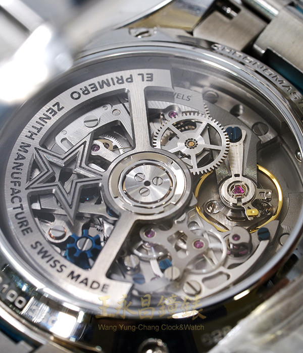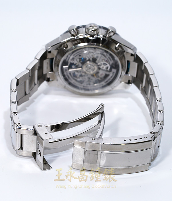 具時.分.秒針.日期顯示、1/10秒.60秒60分計時、黑色陶瓷速率外圈、弧型藍寶石水晶玻璃、透明錶背、60小時動力儲存