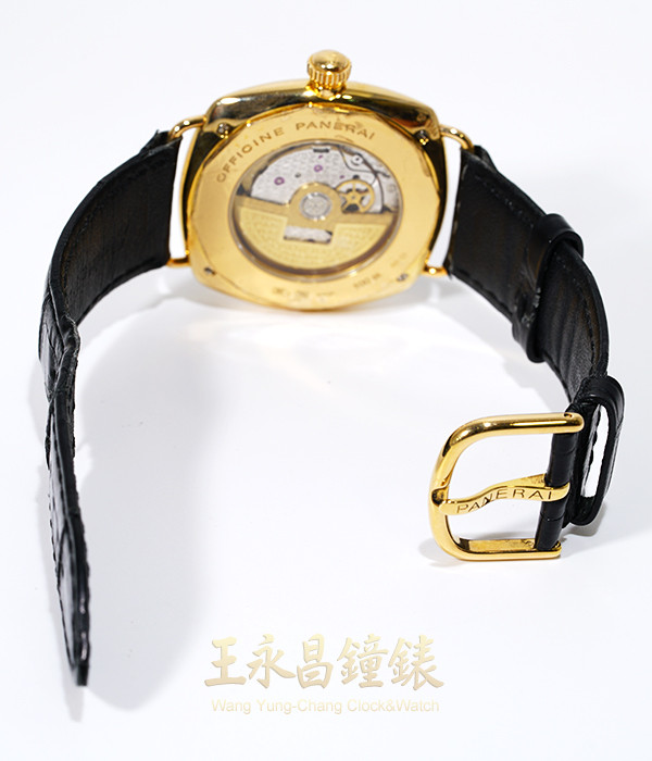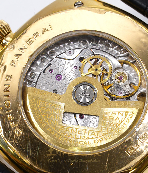 具時.分.小秒針.日期顯示、鍍銠機芯有魚鱗紋及Panerai的商標、Zenith機芯、26顆紅寶石、KIF避振裝置、三臂環形合金擺輪、螺紋微調快慢裝置、弧形藍寶石水晶玻璃、透明錶背