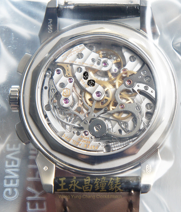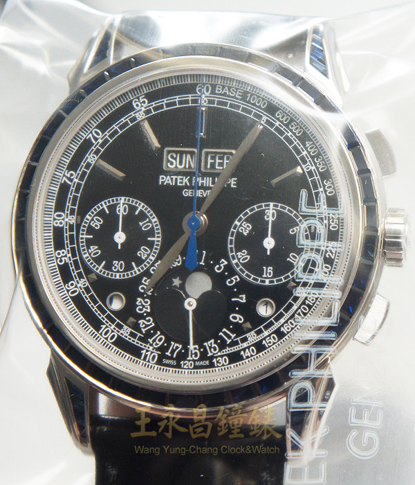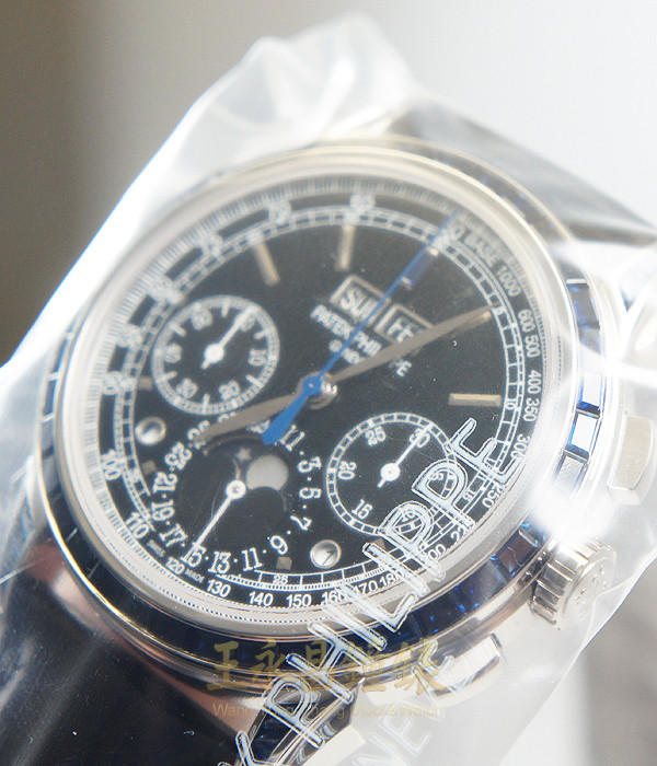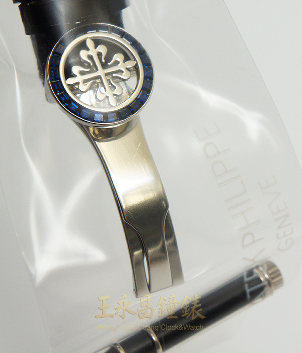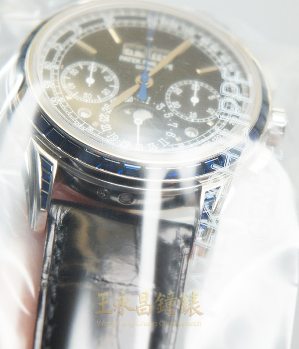 具時.分.小秒針.日期.窗式星期月份.白天夜晚視窗.潤年視窗及月相盈虧顯示、60秒30分12小時計時功能、錶殼.錶耳及帶扣由原廠鑲有藍色寶石80顆、6點方位錶殼上有一顆鑽石、弧形藍寶石水晶玻璃、透明底蓋 黑色面盤.白金立體刻度時標及柳葉形白金指針.面盤外圍有1/5秒刻度.速率及鐵軌形分刻度標示.12點方位有一顆長方形藍寶石石時標.是最新Patek Philippe頂級錶款五窗六針