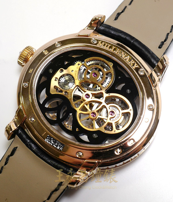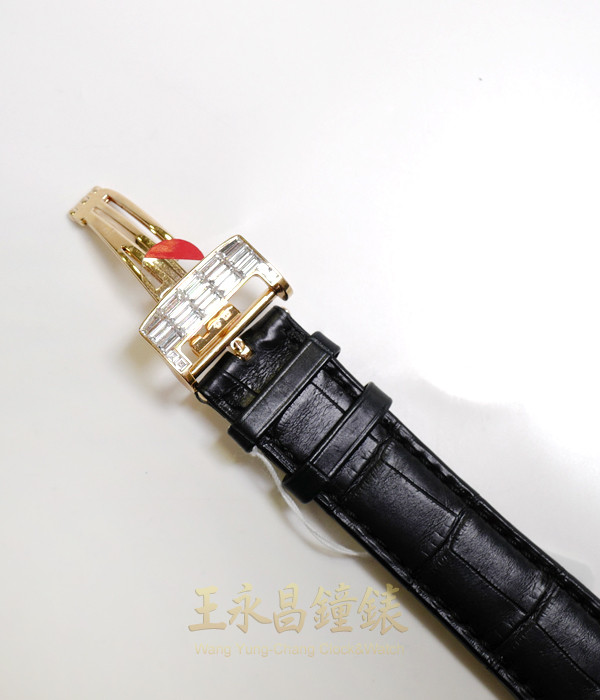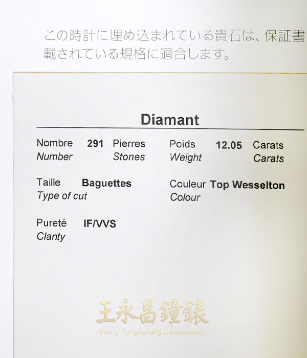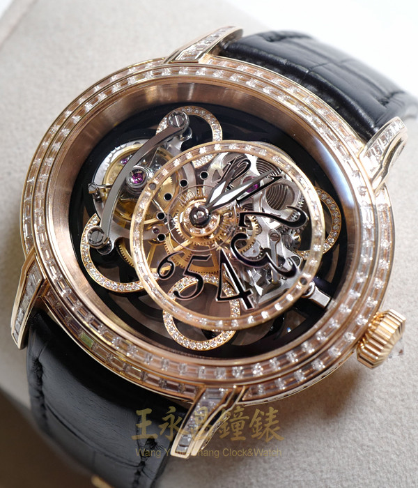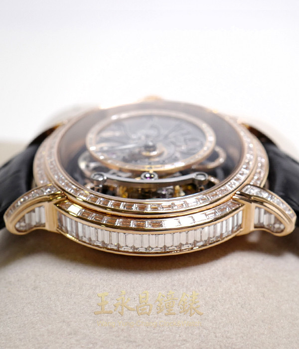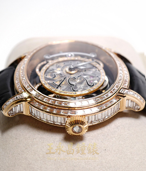 具時.分針及陀飛輪顯示、內圈.錶殼.錶殼側邊.錶耳.機板及折疊扣皆由原廠鑲有方型鑽石共291顆約12.05cts、錶冠有一顆鑽石、弧型藍寶石水晶玻璃、透明錶背 鏤空面盤、黑色阿拉伯數字時標、螢光指針