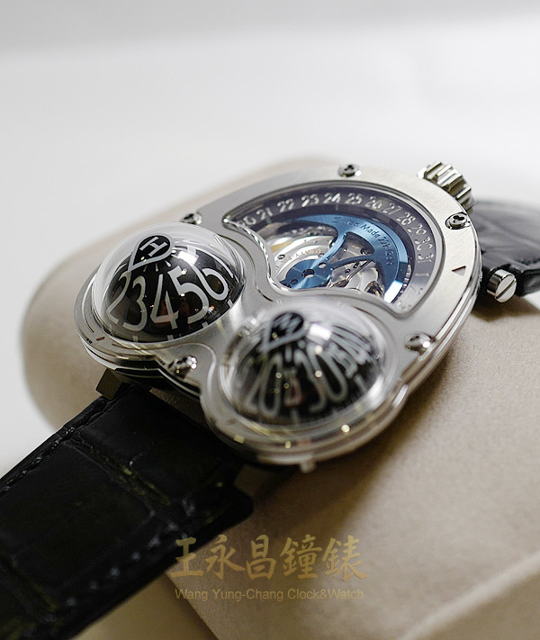 具時、分及日期顯示、固定指針、22K金藍色自動盤、藍寶石水晶玻璃、此表的球形小時和分鐘圓頂能使佩戴者可以輕鬆地從各種角度讀取時間而無需轉動手腕 鋁製半圓形轉盤、螢光阿拉伯數字時標