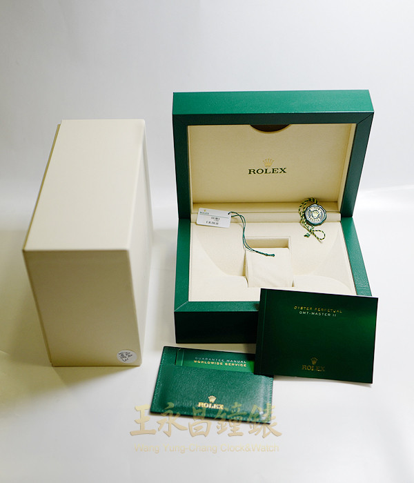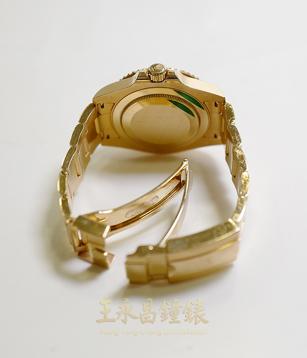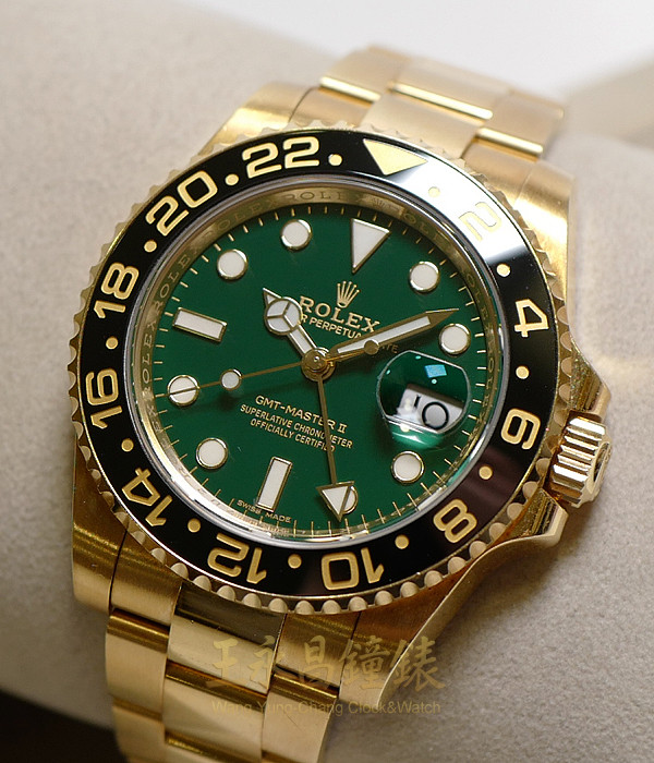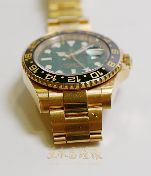 具時.分.秒針及日期顯示、黑色陶瓷雙向可旋轉外圈、金色第二時區指針、時針可快速調校、旋入式錶冠及底蓋、藍寶石水晶玻璃、內圈刻有一圈防偽ROLEX字樣及流水號、亂碼字頭 綠色面盤、立體螢光刻度時標、賓士型螢光指針