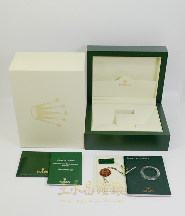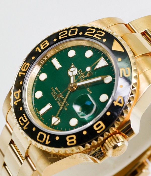 具時.分.秒針.日期及兩地時間顯示、雙向可旋轉黑色陶瓷外圈、藍寶石水晶玻璃、內圈刻有一圈防偽ROLEX字樣及流水號碼、Z字頭 綠色面盤、立體螢光刻度時標、螢光指針