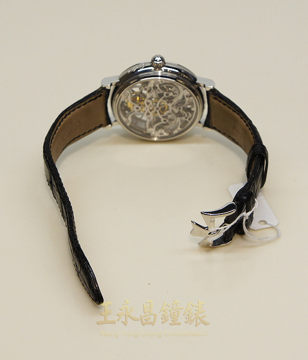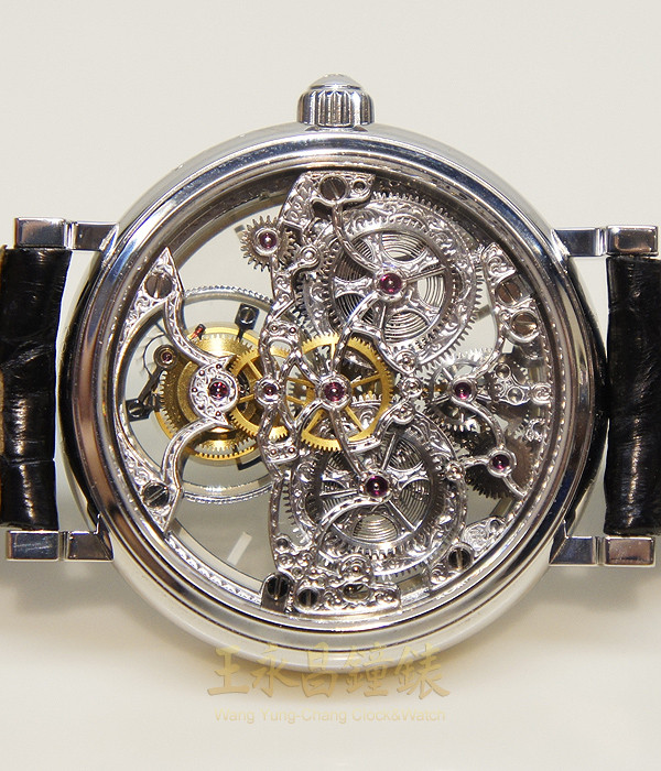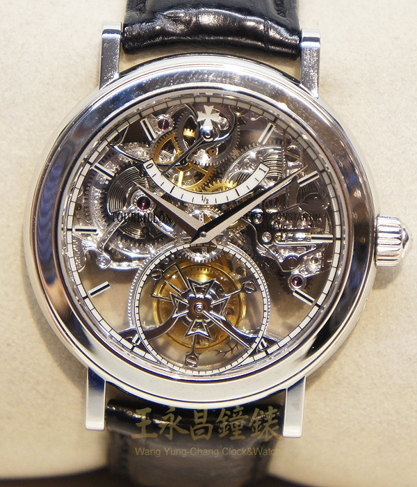 具時.分.小秒針及動力儲存顯示、寶璣同軸式一分鐘陀飛輪裝置、藍寶石水晶玻璃、透明錶背 鏤空面盤、白金雙色劍形指針