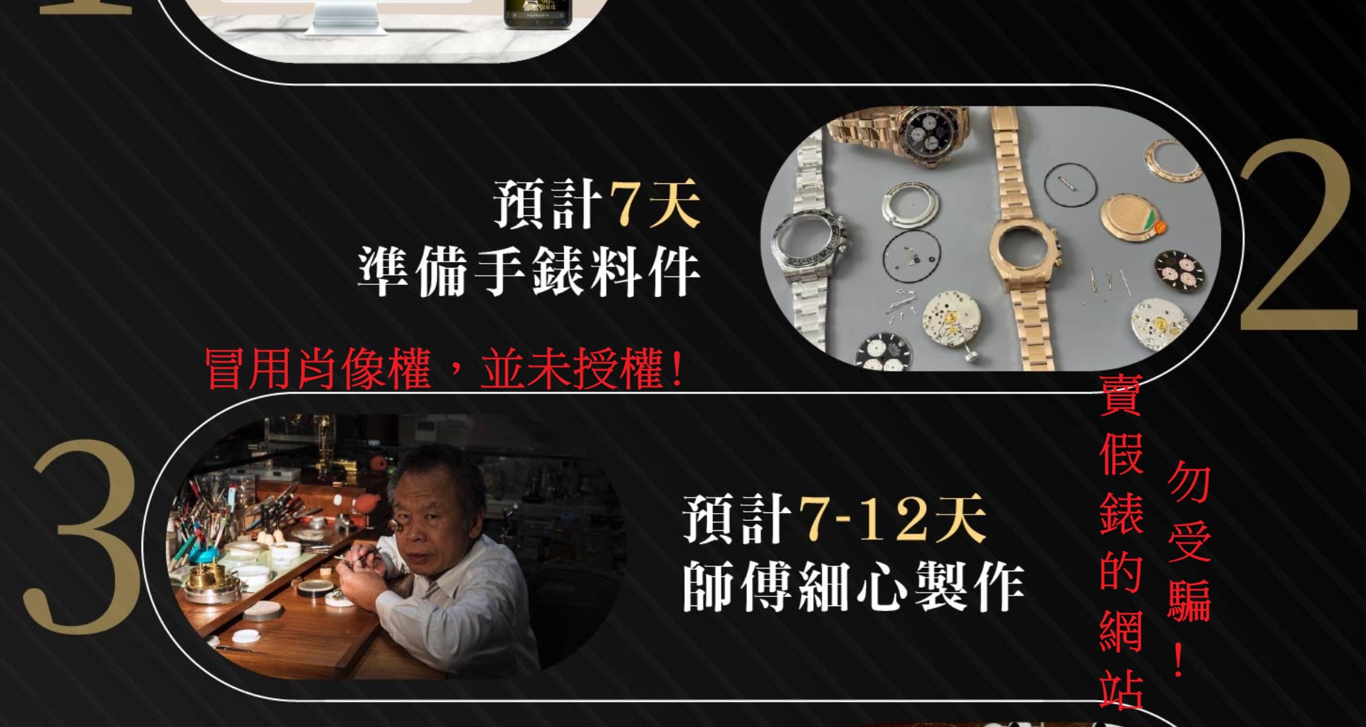 經客人反應,有間販售"假錶"的網站冒用王老闆的肖像權替它們背書,並非我們授權的,請瀏覽網站的客戶要注意不要被欺騙。