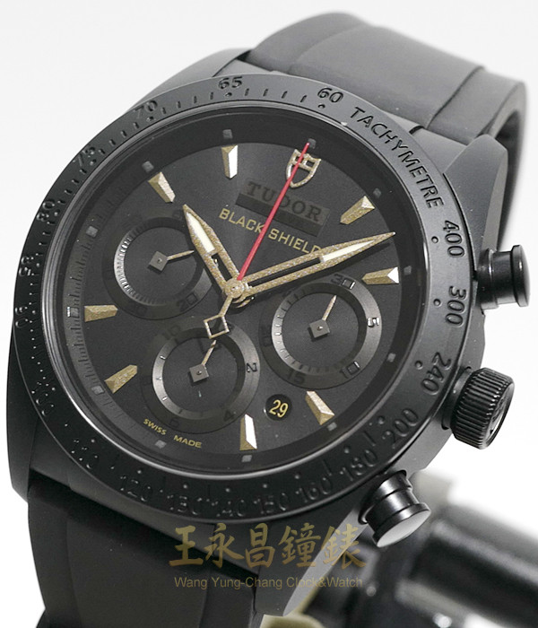 具時.分.小秒針及日期顯示、黑色陶質測速外圈、黑色PVD鍍層不銹鋼旋入式上鏈錶冠,刻有帝舵表標誌 黑色PVD鍍層計時按鈕、60秒30分及12小時計時功能、日期位於四點至五點中間、藍寶石水晶玻璃