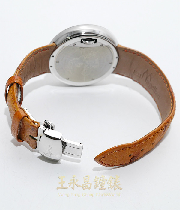 面盤中心有彩繪地圖,周圍有珍珠母貝面盤,面盤上有指南針角度及方位顯示、紅色秒針、金色圓點的第二時區指針