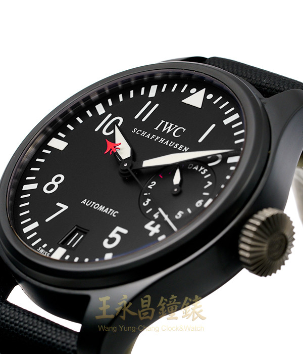 具時.分.秒針.日期及七日動力儲存顯示、旋入式大錶冠及底蓋、防眩弧型藍寶石水晶玻璃、底蓋有TOP GUN 字樣