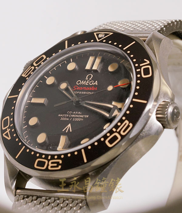 具時.分.秒針顯示、單向可旋轉棕色陶瓷外圈、旋入式錶冠及底蓋、藍寶石水晶玻璃、底蓋上有007的代號
