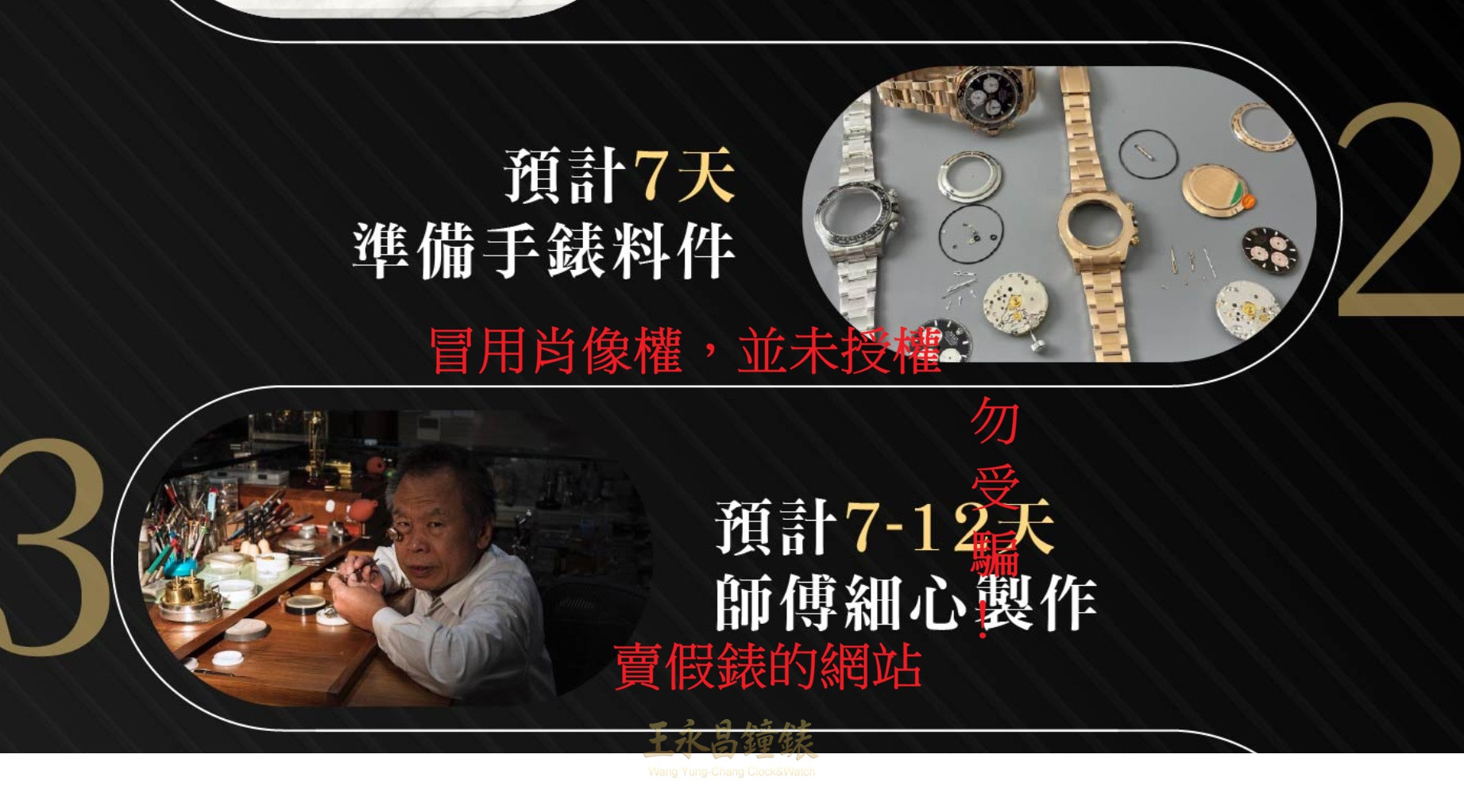經客人反應,有間販售"假錶"的網站冒用王老闆的肖像權替它們背書,並非我們授權的,請瀏覽網站的客戶要注意不要被欺騙。