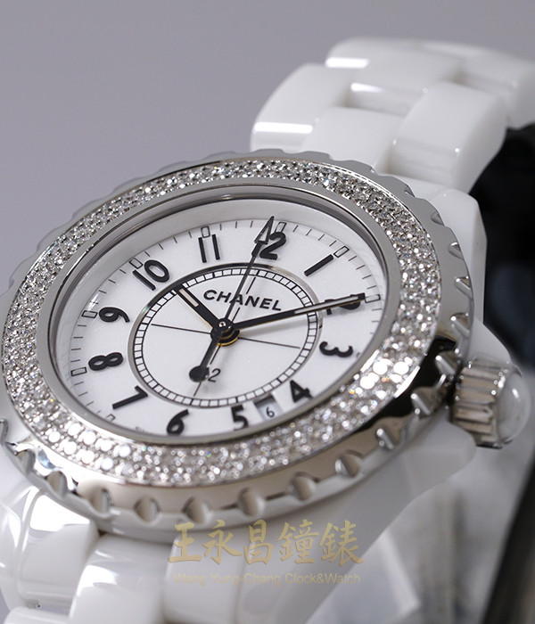 具時.分.秒針及日期顯示、單相可旋轉原鑲鑽外圈、旋入式錶冠、弧形藍寶石水晶玻璃 白色面盤、立體阿拉伯數字時標、螢光指針 原廠白色陶瓷鍊帶