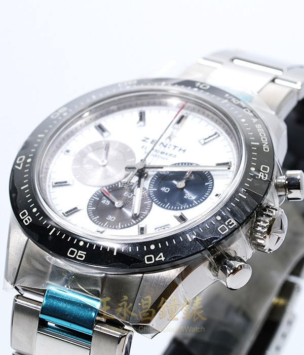 具時.分.秒針.日期顯示、1/10秒.60秒60分計時、黑色陶瓷速率外圈、弧型藍寶石水晶玻璃、透明錶背、60小時動力儲存